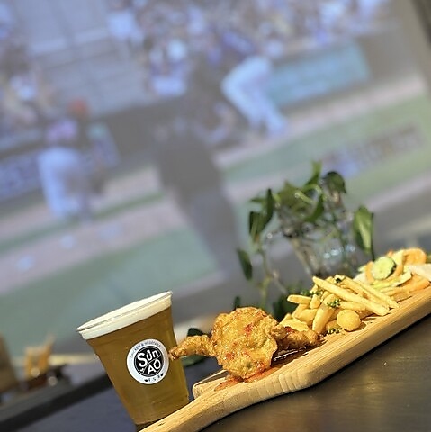 藤崎駅から徒歩5分。キッチンカーが目を引くお洒落なガレージ風の店内は、広々とした開放感が魅力です。200インチの超大型プロジェクターを完備しており、スポーツ観戦や映画鑑賞、団体での貸切パーティーにも最適。非日常を感じるワクワクする空間で、大切な仲間と思い出に残る賑やかな時間をお過ごしください。