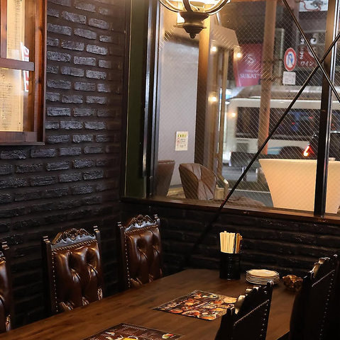 温かみのある照明とレンガ調の壁が印象的な、アンティーク感漂うお洒落な空間。ゆったりと配置されたヴィンテージ風の椅子やインテリアが、大人の隠れ家のような雰囲気を演出します。日常を忘れて、落ち着いた時間を過ごしたい時にぴったりなアメリカン酒場です。