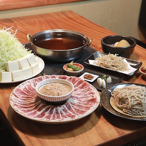 「鴨」と「芋豚」を一度に味わう贅沢な特選コース。蕎麦屋の粋を凝縮した「十割そば揚げチップス」と「蕎麦前三種盛り」で宴が始まります。メインは鴨のコクと芋豚の甘みが特製出汁に溶け合う「鴨と芋豚のネギしゃぶ」。ネギの香りと深い旨みをご堪能ください。〆は特製つゆで味わう十割蕎麦。接待から宴会まで記憶に残るひとときを。飲み放題プランのグレードアップも追加可能です。