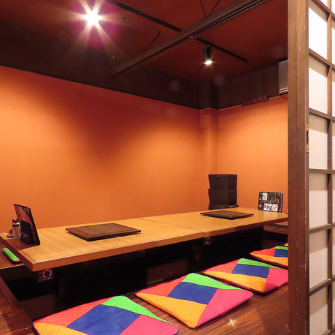 店内には足を伸ばしてリラックスできる掘りごたつ席を完備しております。温かみのあるオレンジ色の照明と落ち着いた色調の内装が、心地よい空間を演出♪少人数の飲み会からご家族での食事まで、周りを気にせずゆったりとお寛ぎいただけます。カラフルな座布団がアクセントの、アットホームな雰囲気の座席です。