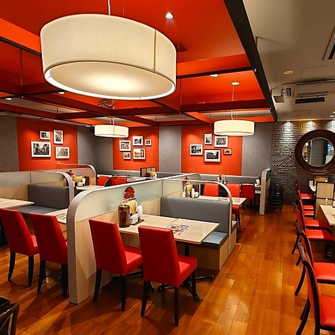 鮮やかな赤のインテリアと、柔らかな灯りをともす大型照明が調和!落ち着いて食事ができる洗練された空間です◎