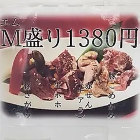 一度は食べて頂きたい名物の「M盛り」は、「豚さがり」、「牛ホホ」、「赤せん(ギアラ)」、「豚こめかみ」など、珍しい部位を一皿でお得に楽しめるオススメのメニュー。仕入れにこだわっているため、お肉はとても新鮮な状態でご提供◎本来の旨みと多彩な食感を1380円でお得に思う存分楽しめるオススメメニューです♪