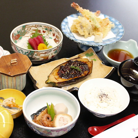前菜3種 お造り 焼物(焼魚又は米茄子田楽) 揚物 茶碗蒸し ご飯 お味噌汁 香の物 フルーツ