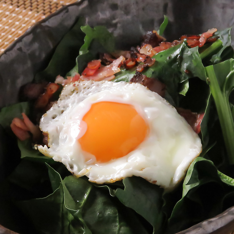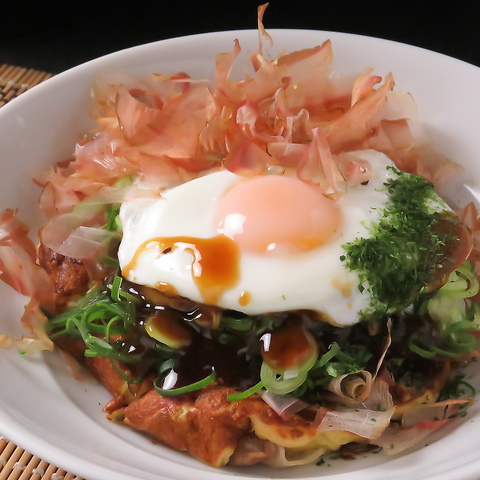 ボリューム満点!自慢の豚玉の上に、シャキシャキの九条ネギ、香ばしく焼き上げたトロロ、さらに目玉焼きを贅沢にトッピングしました。タワー状にそびえ立つ圧倒的なビジュアルは、驚くこと間違いなしの看板メニューです♪具だくさんで満足感たっぷりな一皿を、ぜひ皆様でシェアしてお楽しみください◎