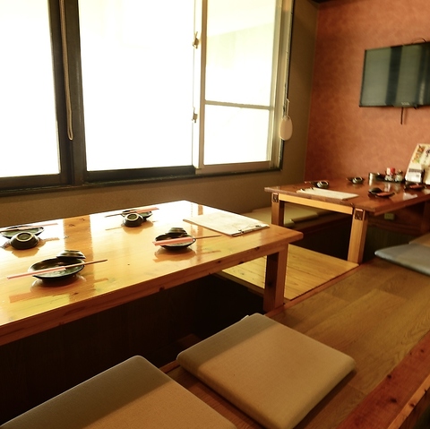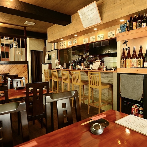 調理の様子を間近で見ることができるカウンター席、まさに特等席です。豪快に立ち上がる藁焼きの炎を眺めながら、ライブ感あふれるお食事をお楽しみいただけます。店内は落ち着いた雰囲気に包まれており、お一人様でゆっくりと流れる時間を楽しむのにも、大切な方としっぽり語り合うのにも最適です。木の温もりを感じる空間で贅沢なひとときを!
