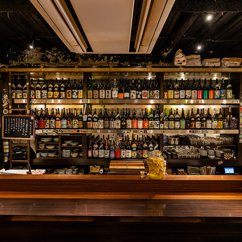 カウンターからは壁一面にずらりと並ぶ酒瓶が目を引く、圧巻の空間。焼酎をはじめに日本酒、ウイスキーなど選び抜かれた銘柄が彩り豊かにそろい、眺めているだけでも心が躍ります。料理との相性を考えた一杯を楽しみながらゆったりと語らう大人の時間をお過ごしください。