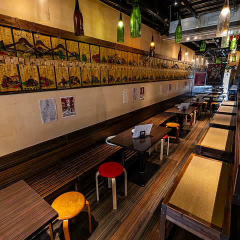 店内は大衆的な空気が漂い、幅広い年代の方におすすめです♪カウンター壁には一面に焼酎瓶がずらりと並び、お酒好きにはたまらない景色が広がります!仕切りのないオープンな座席レイアウトは、仲間と肩を寄せ合って楽しむ宴にぴったり★賑わいを感じながら、思い切り食べて飲める空間が整っています◎