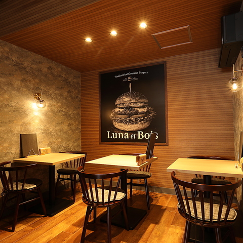 木の温もりを活かした壁面と、シックなライティングが調和する落ち着いた空間です。大きなハンバーガーのアートが目を引き、こだわり抜かれた「Luna et Bois」の世界観にどっぷりと浸ることができます。ゆったりとした時間が流れるこの席は、大切な人との語らいや、自分へのご褒美ディナーにぴったりの特等席です。