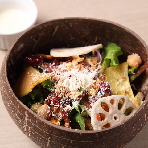 自然の温もりを感じるココナッツボウルに、色鮮やかな旬の野菜を詰め込んだヘルシーなサラダです。シャキシャキのレタスに、素揚げした蓮根やカボチャのチップスが心地よいアクセントを添えます。たっぷりと振りかけられたチーズのコクと、別添えのクリーミーなドレッシングが、素材本来の甘みを一層引き立てる一皿です。