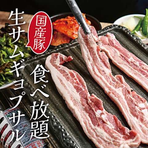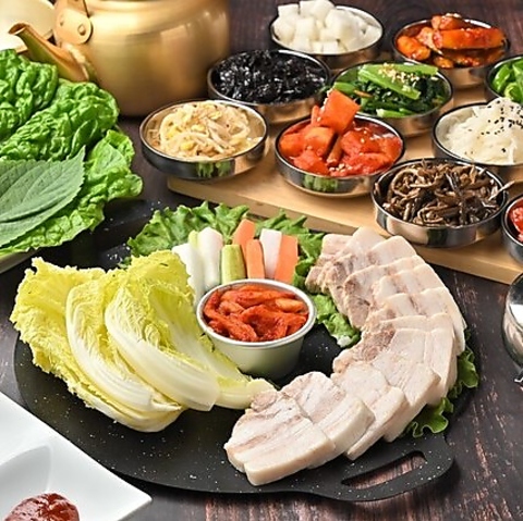 OPEN記念の特別コースは、国産生サムギョプサルセットを思う存分楽しめます。2cm厚の極厚豚バラを使用し、サンチュや自家製ナムル、各種薬味と共に本格的な韓国の味わいを体験できます。さらに、チョレギサラダやニラチヂミ、フライドチキン、韓国インスタントラーメンなど一品料理も食べ放題!飲み放題メニューも充実♪