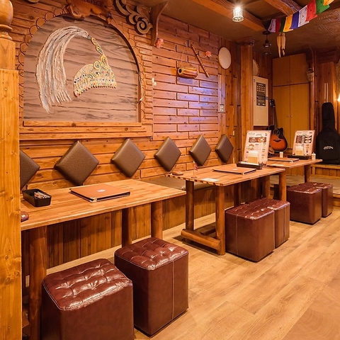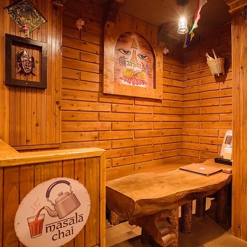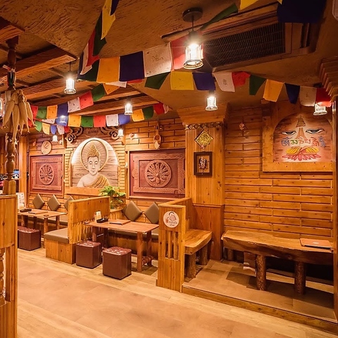 木の温もりに包まれた店内は、色鮮やかな灯りが織りなす幻想的な空間。壁一面の仏画や精巧な木彫りが、まるで異国の隠れ家に迷い込んだような旅情を誘います。落ち着いたボックス席で日常を忘れてゆったりと寛げる、心安らぐ癒しのひと時をぜひここで過ごしてみませんか?