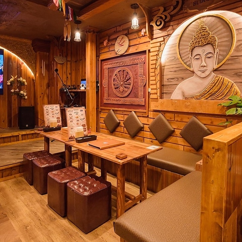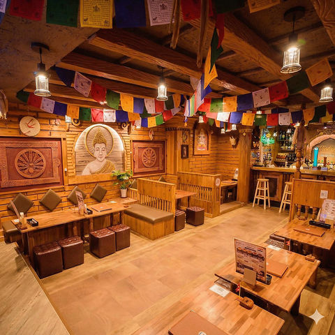 木の温もりに包まれた店内は、色鮮やかな灯りが織りなす幻想的な空間。壁一面の仏画や精巧な木彫りが、まるで異国の隠れ家に迷い込んだような旅情を誘います。落ち着いたボックス席で日常を忘れてゆったりと寛げる、心安らぐ癒しのひと時をぜひここで過ごしてみませんか?