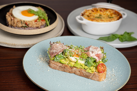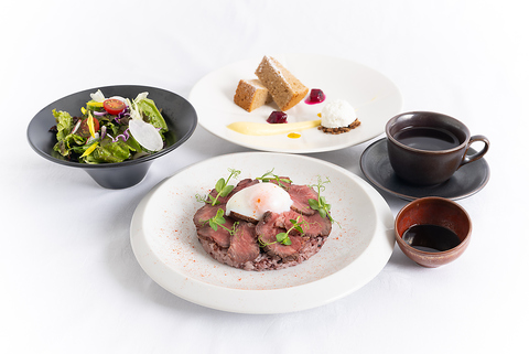 A5ランクの牛肉を贅沢に使用したローストビーフを、鹿児島産の黒米と白米をブレンドしたご飯にたっぷりと。シェフ特製の甘露醤油ソース、または自家製グリルソースから好みで選べるのも魅力。上質さを感じる一杯です。