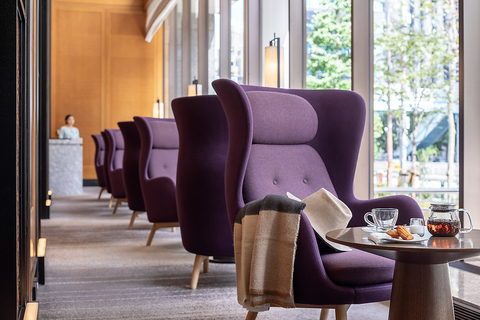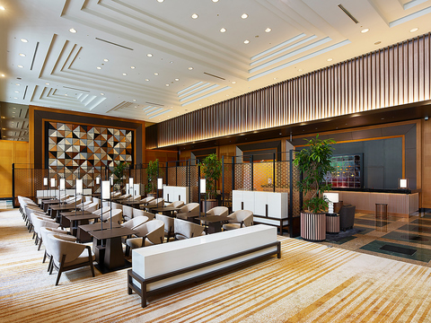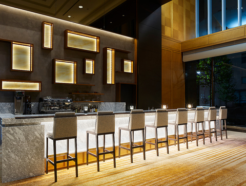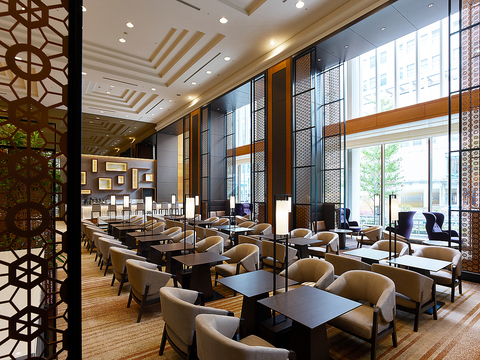 天井の高い開放感ある空間に、柔らかな照明と洗練されたインテリアが調和するホテルラウンジ。席の間隔もゆったりと配され、都会にありながら静けさに包まれる大人の隠れ家。ひとり時間から大切な人との語らいまで、上質なひとときを過ごせます。