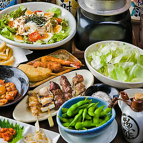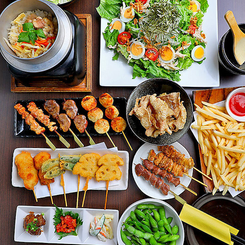 ジューシーな炭火焼鳥や自慢の串カツ、炊きたての釜めしを存分に味わっていただける、飲み放題付宴会コースを3,500円~ご用意!お酒のお供にぴったりな、おつまみメニューや揚物メニューも豊富に盛り込みました。お得なぐるなびクーポンも要チェック!8名様以上のコースをご予約で、1名様の料金が無料になります♪
