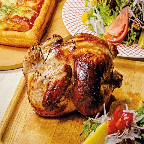 当店イチオシのロティサリーチキンはお二人でのシェアに◎脂を落としたパリパリ皮で、お酒も進みます♪