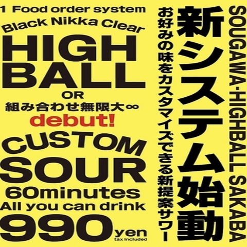 60分990円(税込)でハイボールorカスタムサワーが飲み放題となっております!!各お席にサーバーを設置しており、セルフ式なのでお待たせ時間がありません♪お好きなようにお楽しみください。ご利用条件の詳細は、お気軽にお声がけください☆