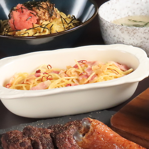 二次会や三次会でぜひ試してほしいのが、こちらの「納豆たらこパスタ」です♪ひきわり納豆を使用し、特製の出汁をたっぷり効かせることで、まるで飲み物のようにスルスルと食べやすく仕上げました◎深夜の〆にはこれ一択です!