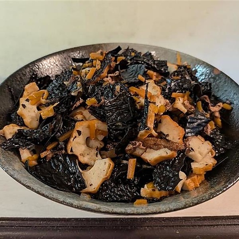 島根県・隠岐の荒波で育った海藻「あらめ」を使用。一般的なひじきよりも肉厚で、独特の歯ごたえと芳醇な磯の香りが特徴です。さらに、その力強い風味を活かすため絶妙な火加減で炒め、出汁をじっくり含ませて仕上げました。噛むほどに広がる滋味深い味わいは、山陰の地酒との相性も抜群な郷土の逸品です。