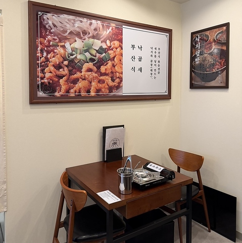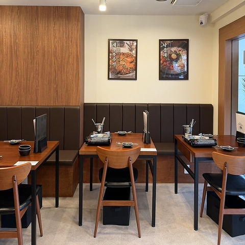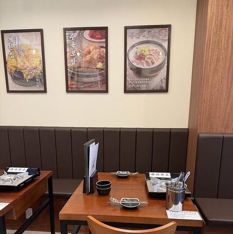 モダンな席が並び、その奥には韓国語の看板が掲げられています。清潔感あふれる店内は、本場の韓国料理店を思わせる活気と温かさを兼ね備えています。一人でも気軽に立ち寄れる雰囲気で、本格的な韓国の味と空間をお楽しみいただけます。