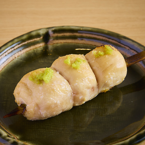 毎朝丸鶏で仕入れた新鮮な鶏を一本一本丁寧に串打ちし、炭火でじっくり焼き上げるささみ。外は香ばしく、中はふっくらしっとりとした食感に仕上げています。白く美しい身に添えたわさびが爽やかなアクセントとなり、噛むほどに鶏の上品な旨みが広がります。炭火の香りとともに、日本酒やお酒が思わず進む串達を是非!