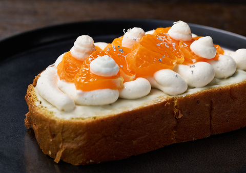フレーバーパンを使用したブルスケッタを各種販売しています。写真は「みかんと白みそ入り生クリームのブルスケッタ」ホワイトチョコ×白みそ生クリーム×みかん×ピスタチオという組み合わせはコクと酸味、食感が幅広く楽しめます。ケーキのような満足感で贈答用にもオススメ
