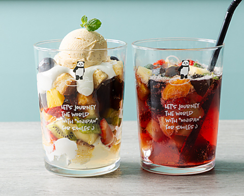 フルーツをたっぷり使用したオリジナルフルーツポンチ※テイクアウトの場合はプラスチックカップにて提供です。食べるフルーツポンチ(左)には、手作りアイスをはじめ、虹生ソフトフランスパンでつくったラスクを使用したこだわりの一品。飲むフルーツポンチ(右)は、お好みのベースドリンクをお選びいただけます。