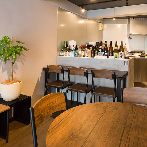1人でも利用しやすいカウンター席は、店内の観葉植物と優しい照明によって特別な癒しを届けます♪カップルや仲の良い友人同士での食事にも適した二人席、座りやすい丸テーブルなど用途に合わせたレイアウトをご用意★隣席との間隔にも配慮し、プライベートな時間をしっかり確保できる安心感があります◎