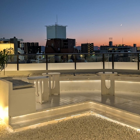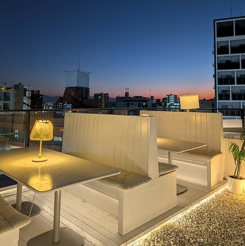 落ち着いた灯りと都会の夜景が広がる上質なルーフトップ空間。白を基調とした洗練された席で、特別感あるひとときを過ごせます。ゆったりと座れるボックス席は6名ほどの団体にも対応でき、デートはもちろん、少人数の集まりにも最適な雰囲気自慢のスポットです。