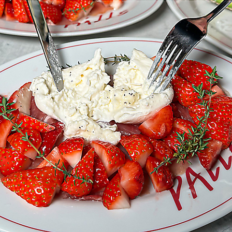 『いちごとブッラータチーズ』は、濃厚でとろけるブッラータをトップに、下には旨みのある生ハムを忍ばせ、旬のいちごをふんだんに散りばめた一皿。仕上げに蜂蜜をとろりとかけることで甘み・塩気・クリーミーさが調和し、香り高く贅沢な味わいに。見た目も華やかで、前菜にもデザートにも楽しめる新感覚の組み合わせです。