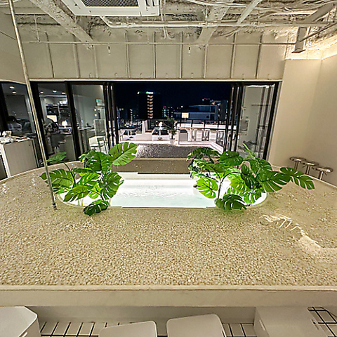 開放感あふれる外カウンターは、一人でも気軽に過ごせるゆったりとしたつくり。静かな空と街並みを眺めながら、自分だけの時間を楽しめます。白を基調とした洗練空間と控えめな灯りが心地よく、雰囲気を大切にしたい方にぴったりの特別なルーフトップです。