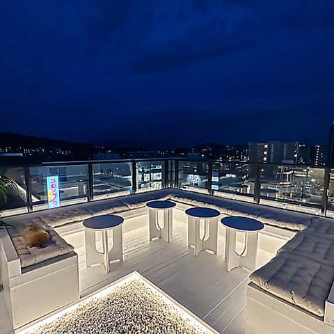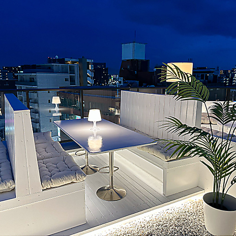 落ち着いた灯りと都会の夜景が広がる上質なルーフトップ空間。白を基調とした洗練された席で、特別感あるひとときを過ごせます。ゆったりと座れるボックス席は6名ほどの団体にも対応でき、デートはもちろん、少人数の集まりにも最適な雰囲気自慢のスポットです。