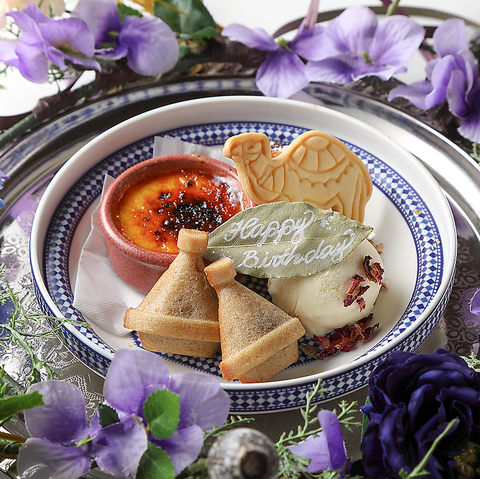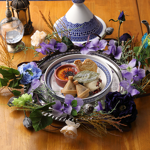 モロッコ風の美しいプレートを使用したオリジナルのバースデープレートをご用意。異国情緒あふれる華やかな見た目とともに、大切な方へのお祝いをより特別なひとときへと演出します。デザートは厳選した内容で、食後でも心地よく楽しめる仕上がりに。誕生日や記念日、サプライズにもおすすめ。浦和で思い出に残るお祝い時間をお過ごしください。