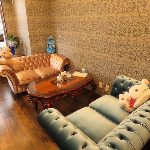 店内に一歩足を踏み入れると、そこはうさぎたちがもてなす癒やしの森。アンティーク調のテーブルや、座り心地を追求したベルベットのソファーが、落ち着いた大人の空間を演出します。お一人様で本を読んだり、大切な方と語らったり。長く座っても疲れにくいお席で、穏やかな時間をお過ごしいただけます。