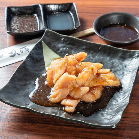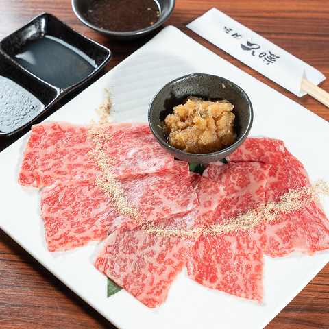 薄くスライスした部位を軽く焼き上げ、特製のおろしポン酢で召し上がっていただきます。シャキシャキとしたカイワレ大根の食感と、清涼感のあるタレが絶妙にマッチ◎焼き身のような感覚で楽しめ、脂の甘みを引き立てつつも後味軽やか。野菜の風味と共にご堪能ください。