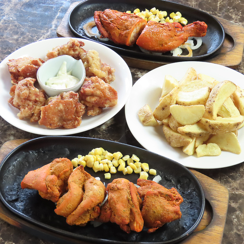 熱々の鉄板でジュージュー音を立てる「極上ステーキ」と「タンドリーチキン」は肉汁溢れる自慢の逸品!とろ~り「チーズナン」やホクホクポテトなど、老若男女問わず大好きなメニューが勢揃い。ご家族での食事や仲間との賑やかなご宴会にぴったりの大満足ボリュームです!