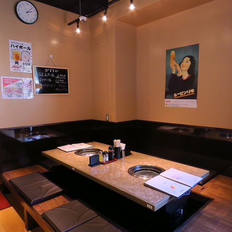 創業30年の伝統と寛ぎが溶け合う空間。各テーブルに配置された強力な無煙ダクトが、衣服への匂いを気にせず焼肉に没頭できる心地よい時間を演出します。店内は一体感に優れた正方形の造りで、30名様の大宴会でもお席が分断されません。さらに足を伸ばせる掘りごたつ座敷は、お子様連れでも安心して過ごせる特等席です!