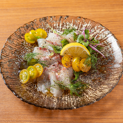 その日に仕入れたばかりの旬の魚介を使用した「鮮魚のカルパッチョ」は当店必食の逸品です。素材本来の甘みを最大限に引き立てるのは、ハーブソルトとオリーブオイル◎キリッと冷えた白ワインやナチュラルワインとの相性も抜群です。最初の一皿として、まずは新鮮な海の幸の輝きをぜひお楽しみください♪