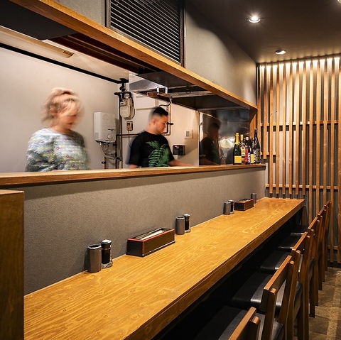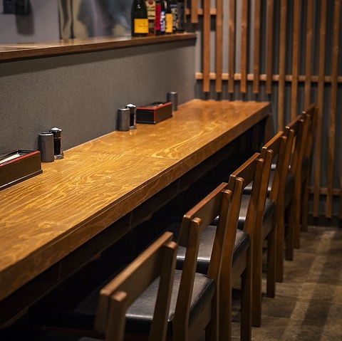 カウンターメインの落ち着いた和モダン空間で、お一人様から利用しやすく、隣との距離も程よい座席配置です
