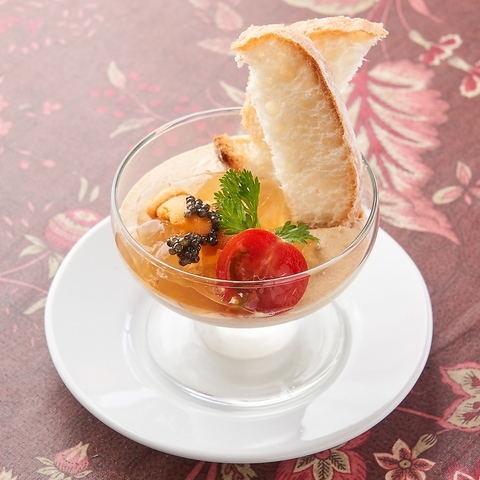 高級食材を惜しみなく使った、見た目も華やかな至極の前菜です。魚介の旨味が詰まった特製ジュレの上に、口どけ滑らかなウニのムース、新鮮な生うにとキャビアをトッピング!一口食べれば磯の香りと濃厚なコクが広がり、ワインが止まらなくなる一品。セルフ式だからこそ実現できた驚きの価格でご提供します。