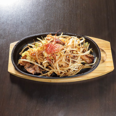 名物鉄板豚皿は600円(税込)で味わえる逸品♪脂の旨み広がる豚バラとカシラの食感が魅力で、旨辛ダレが野菜と絡み絶妙なハーモニーを演出します☆ご飯にもお酒にも合う味わいでお箸が止まらないと人気!香りと熱々の食感をぜひお楽しみください◎
