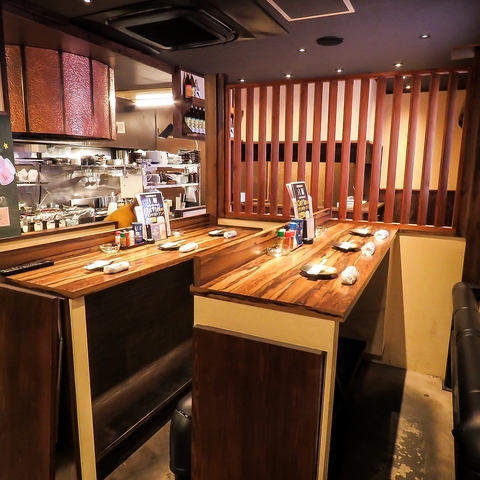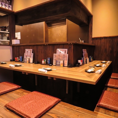 当店に入って右奥にはL字のカウンター席を完備!毎日仕事帰りのおひとり様やご友人同士のお客様がご利用されてます!掘りごたつ席なので、長い時間ゆっくりとお過ごしいただけます!