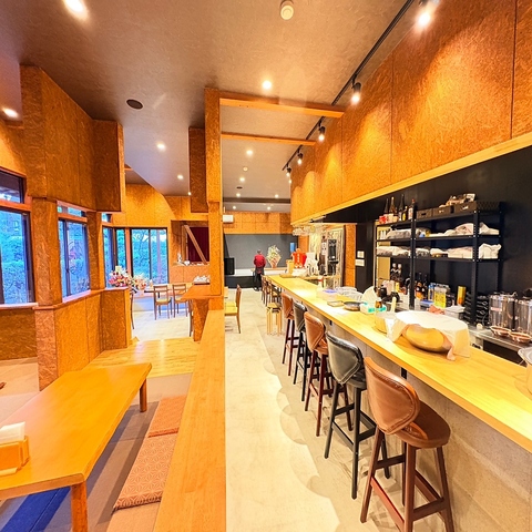 店内は木の温もりが溢れる落ち着いた空間が広がっています♪大きく取られた窓からは、緑豊かな美しい庭園を眺めることができ、開放感抜群です◎窓際にある一枚板のカウンター席は、景色を楽しみながらゆったりとお食事やドリンクを味わえる特等席!日常の喧騒から離れ、自然の美しさに癒やされながら、心安らぐ贅沢な時間をお過ごしください♪