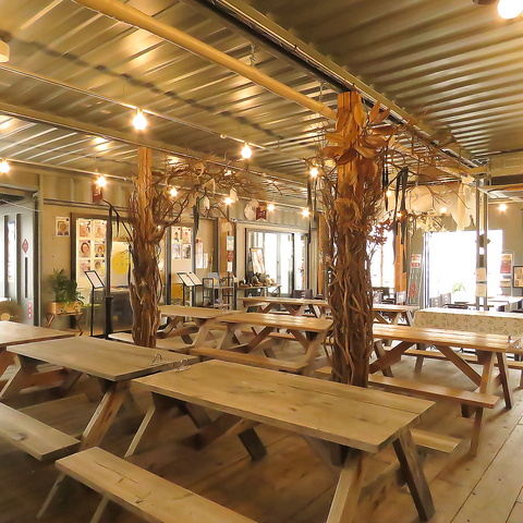 一歩足を踏み入れると、木の温もりあふれる空間が広がります。天井に配されたおしゃれな装飾と、優しく灯る裸電球が幻想的な雰囲気を演出。コンテナのインダストリアルな質感と、自然素材のテーブルが絶妙にマッチしています。広々とした店内は、友人や女子会、家族団らんにも最適!心地よい時間が流れる店内でスパイス料理をお楽しみください◎