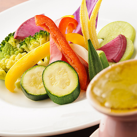 (イタリアのオイルフォンデュ) リベルタの大人気メニューの1つで、自然農法にこだわる彩り農園さんのおいしくてお野菜をリベルタ特製バーニャクダーソースで召し上がれ♪