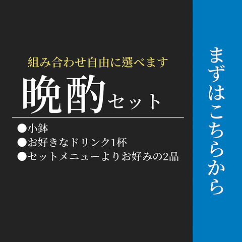 まずはこちら「晩酌セッ」\1,500小鉢+ドリンク1杯+セットメニューよりお好きな2品