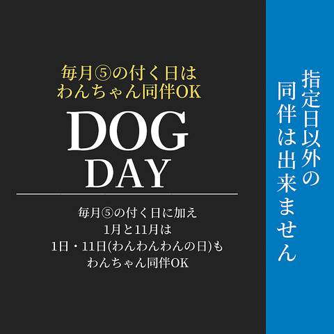 毎月5の付く日はワンちゃん同伴可(要予約)【さらに1月と11月は1日・11日(わんわんわんの日)も同伴可】