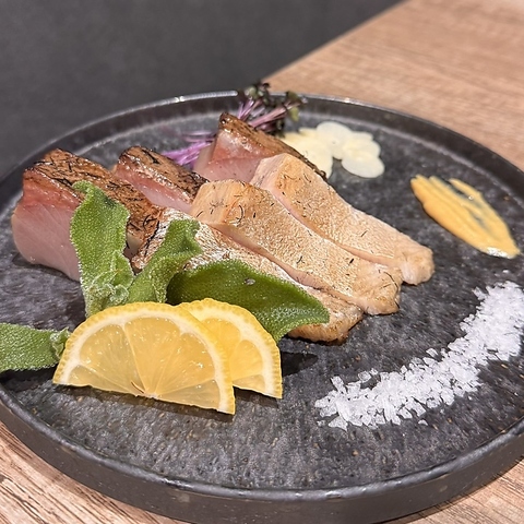 本物のわらを使用し、豪快な炎で一気に焼き上げるこだわりの「ぶりの藁焼き」!わらの燻煙がぶりの旨味をぎゅっと閉じ込め、口に入れた瞬間に豊かな香りが広がります。旬の時期に合わせた脂乗りの良いブリを厳選しており、お酒との相性も抜群◎藁焼きならではの本格的な風味をぜひ一度ご賞味ください。