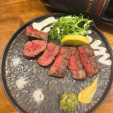 赤身のあっさりとした旨みが特徴の淡路牛カイノミを使用し、レア焼きで仕上げわさび醤油や塩で楽しむ逸品◎