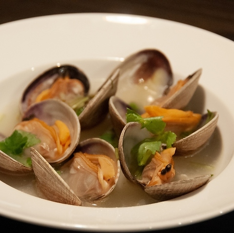 その日仕入れた様々な貝を贅沢に使用した一品です!仕上げに藁焼きの工程を加えることで、通常のワイン蒸しにはない奥深い香ばしさをプラス◎貝から出た濃厚なエキスと白ワインの香りが溶け出したスープは、最後の一滴まで飲み干したくなるほどの仕上がりです。贅沢な海の幸の香りと旨味を存分にお楽しみください。